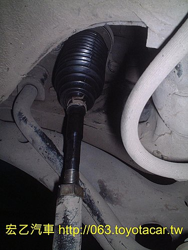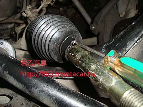 定位要調整舵桿長度時有些車的方向機防塵套會黏得很緊,結果舵桿轉個一圈兩圈後就無法一直轉下去,因為防塵套黏住舵桿會反轉回來,結果這店家直接就拿美工刀劃開防塵套撥開黏住舵桿的部分,然後再來快樂的調整舵桿~